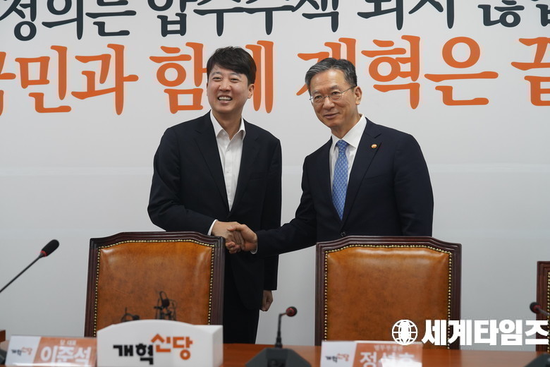 개혁신당 '이준석' 당대표와 '정성호' 법무부 장관이 6일 서울여의도 국회의사당에서 만나 악수하고 있다.
