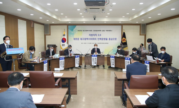[대구=세계타임즈 한성국 기자] 대구광역시의회(의장 장상수)는 지방자치법 개정을 통해 도래한 지방자치 2.0의 시대를 맞이하여 새로운 제도에 맞춰 발전된 운영방안을 모색하고자, 4월 12일(화) 13시 30분 대구시의회 3층 회의실에서 한국정부학회와 공동 기획 세미나를 개최했다.