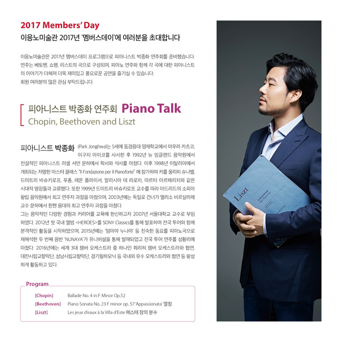 이번 공연은 미술관 멤버십 회원들을 위한 멤버스데이(Members’Day) 행사로, 클래식 거장 베토벤, 쇼팽, 리스트의 곡이 피아니스트 박종화의 손으로 연주된다.