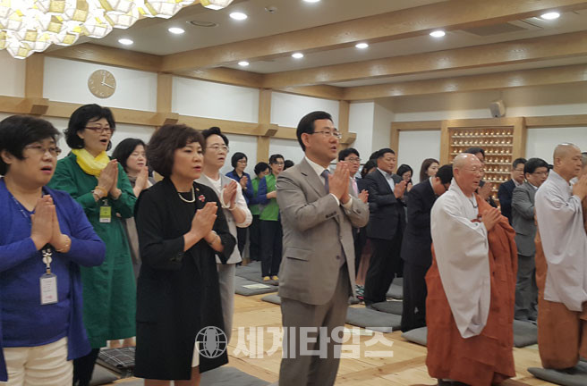 주호영 장각회 회장을 비롯해 이원욱 의원, 김순례 의원, 윤종필 의원과 최순애 시사평론가, 김민희 불자, 국회 직원 신도등들이 비좁은 법당에 빼곡히 참석한 가운데 신도들은 절을 하는데 다소 불편함을 보였다.