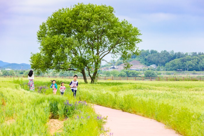 ▲ 함안 강나루생태공원 = 낙동강을 끼고 광활하게 펼쳐진 청보리는 보는 이들의 마음까지 시원하게 만들어 준다. 이외에도 다양한 편의시설과 체육시설을 갖추고 있다.