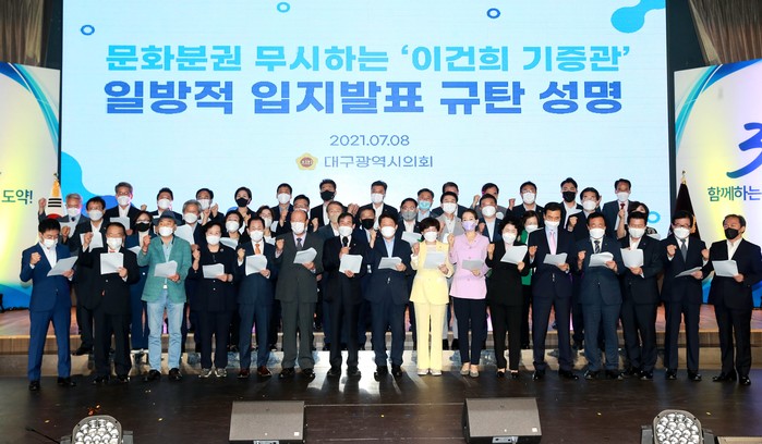[대구=세계타임즈 한성국 기자] 대구광역시의회(의장 장상수)가 7월 8일(목) 오전 중앙컨벤션센터에서 지난 7일 문화체육관광부가 ‘이건희 기증관’ 후보지로 서울 2곳을 발표한 것에 대해 깊은 유감을 표명하며 일방적 입지 발표를 철회하고 전국 공모로 진행할 것을 촉구하는 성명서를 발표했다.