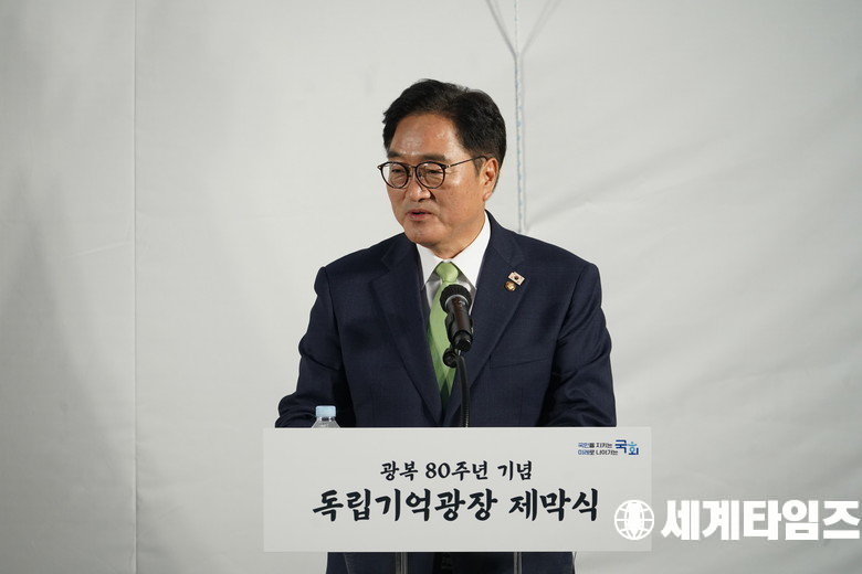 '우원식' 국회의장이 14일 서울 영등포구 국회도서관 앞에서 열린 독립기억광장 제막식에서 축사를 하고 있다.