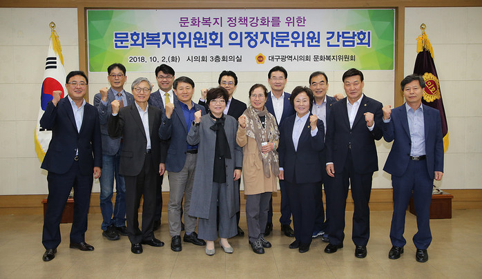 [대구=세계타임즈 이의수 기자] 대구시의회 문화복지위원회(위원장 이영애)는 2018년도 행정사무감사 및 2019년도 예산안 심사에 앞서 10월 2일(화) 11시 시의회에서 문화복지위원회 의정자문위원과 소속 의원 등 13명이 참석한 가운데 문화.복지 정책강화를 위한 간담회를 개최했다.