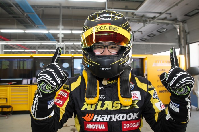 [사진설명]아트라스BX 모터스포츠의 조항우가 15일 전남 영암군 코리아인터내셔널서킷에서 열린 2019 CJ대한통운 슈퍼레이스 챔피언십 3라운드 ASA 6000 클래스 예선에서 1위를 차지한 뒤 기뻐하고 있다.
