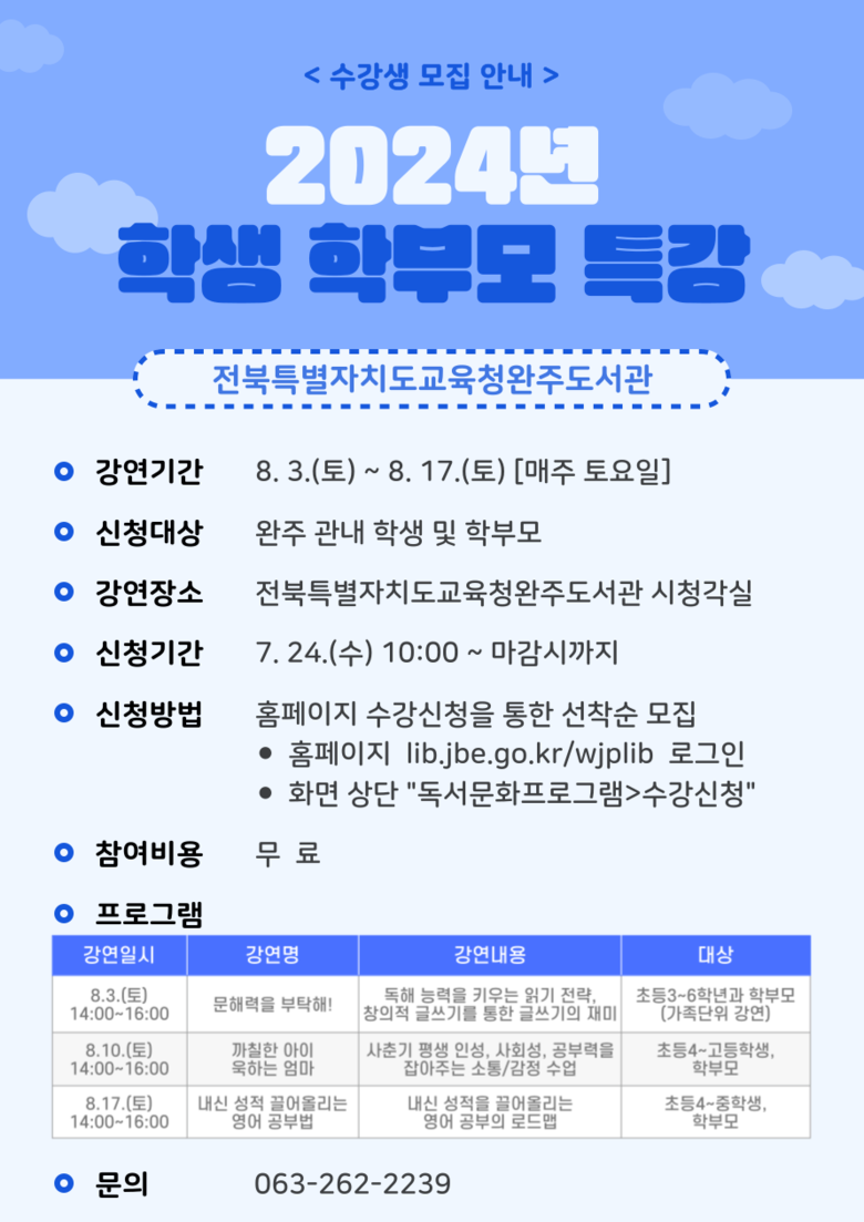 [완주=세계타임즈 이정술 기자] 전북특별자치도교육청완주도서관(관장 육경아)은 학생 및 학부모들을 대상으로 ‘2024년 학생·학부모 특강’을 운영한다.