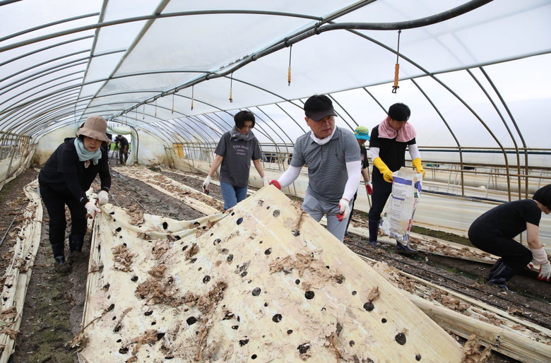 이날 익산시의회 의원들과 의회사무국 직원 등 60여 명은 폭우로 농작물 피해가 발생한 용동면 구산리의 상추 재배농가를 찾아 비닐하우스 안에서 비닐을 수거하고 토사를 제거하는 복구작업에 동참하며 구슬땀을 흘렸다.