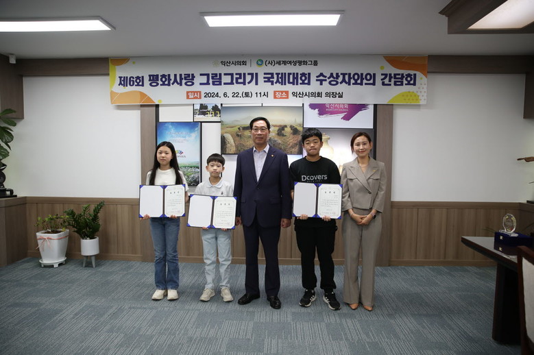 제6회 평화사랑 그림그리기 국제대회는 지난달 18일 익산종합운동장 내 반다비체육센터에서 어린이와 청소년을 대상으로 열린 대회로 최종오 의장은 선예준(익산어양초), 유은채(이리남성여중), 하정우(익산초) 학생에게 표창장을 수여했다.