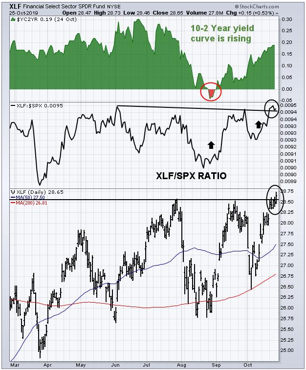 녹색 부분의 상승과 그 아래 차트에 있는 XLF/SPX 상대 강도 비율 간에 밀접한 상관관계가 있음에 주목할 필요가 있다.