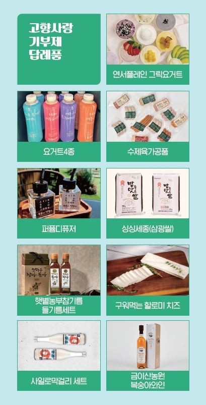 박대순 시민소통과장은 “지역 여건을 고려해 지속적으로 답례품을 확대·발굴할 것”이라며 “기부자들에게 매력적인 답례품을 제공해 기부문화가 확산될 수 있도록 노력하겠다”고 말했다.