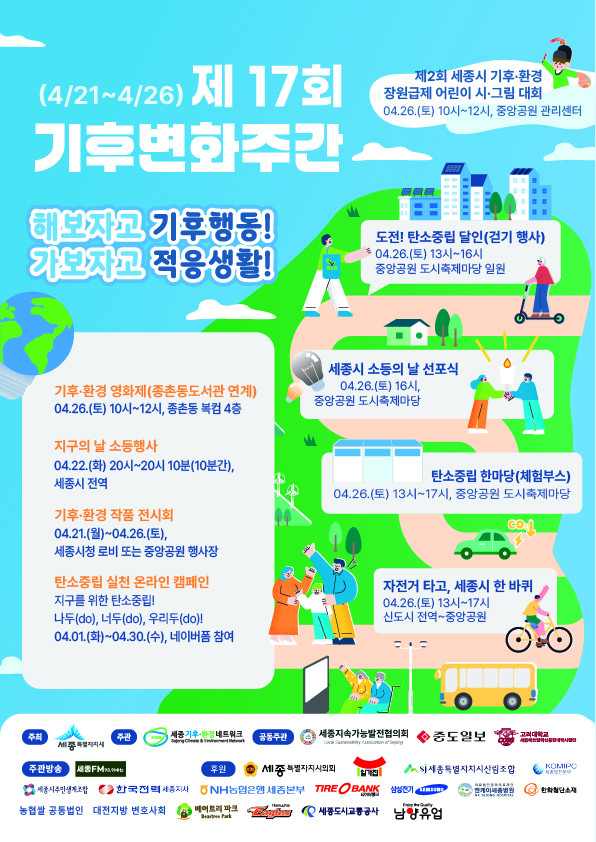 시는 기후변화주간 ▲지구의 날 소등행사 ▲탄소중립 한마당 ▲제2회 세종시 기후·환경 어린이 시·그림대회 ▲기후·환경 작품 전시행사 ▲탄소중립 실천 온라인 캠페인 등을 선보일 예정이다.