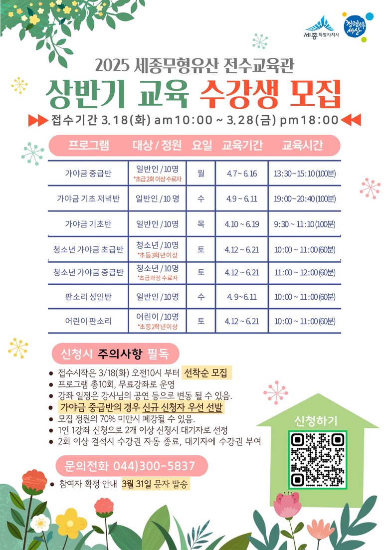 기타 자세한 사항은 시 누리집(www.sejong.go.kr) 공지사항 모집 안내를 참고하거나 전수교육관(☎044-300-5837)으로 문의하면 된다.