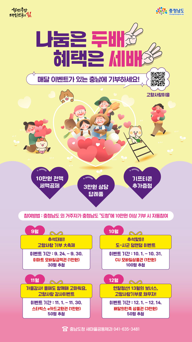 권경선 새마을공동체과장은 “고향사랑기부제에 대한 참여를 더욱 활성화하기 위해 다양한 이벤트를 기획했다”며 “세액공제 및 답례품 혜택과 경품 추첨의 즐거움은 물론, 연말정산 준비까지 미리 챙길 수 있는 기회가 될 것”이라고 말했다.