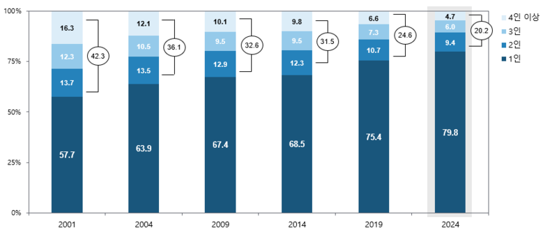 2024년 기준 서울시 전입 가운데 1인 이동 건수 비중은 79.8%로, 2004년 대비 15.9%p 증가했다.