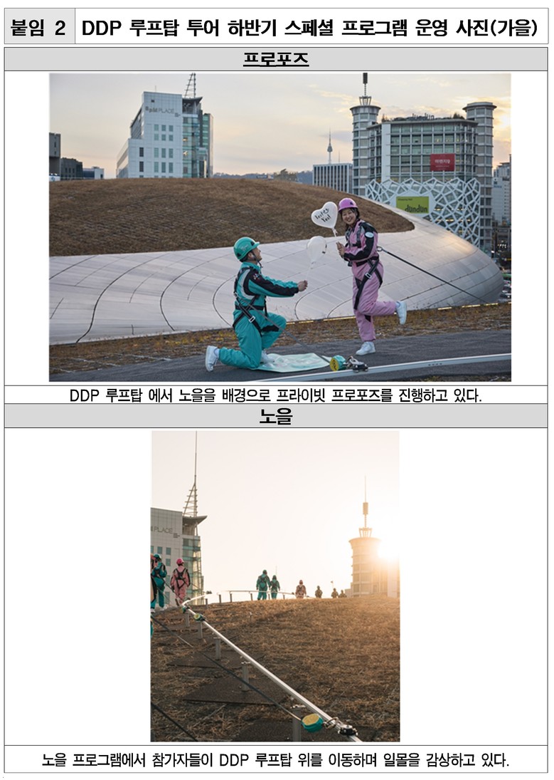 한편 하반기 투어 운영기간 중 총 18만 6334회의 인스타그램 등 온라인 콘텐츠가 검색됐고 예약페이지 클릭 수도 15만7781회에 달했다. 커뮤니티(카카오톡·네이버 카페·페이스북) 내 게시글 조회는 1,886회, DDP 홈페이지 루프탑 투어 페이지 조회는 6,960회로 나타났다.
