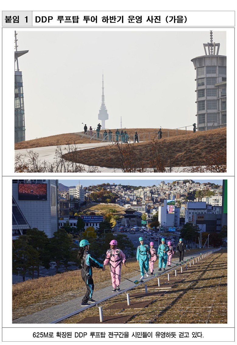 차강희 서울디자인재단 대표이사는 “DDP 루프탑 투어를 서울을 입체적으로 경험하는 ‘서울 최고의 어트랙션 투어’로 자리 잡게 하는 것이 목표”라며, “내년에는 더욱 다양한 스페셜 프로그램과 이벤트로 서울을 대표하는 관광 콘텐츠로 발전시켜 봄에 오픈할 예정”이라고 강조했다.