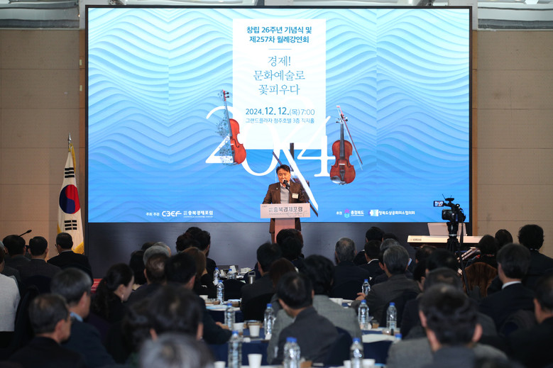 이재진 (사)충북경제포럼 회장은 기념사에서“지난해에 이어 올해 역시 고물가·고금리의 지속, 러-우 전쟁 장기화라는 지정학적 리스크, 트럼프 미 행정부 출범, 대통령 탄핵 정국 등 수많은 경제 한파 속에서 우리 회원분들 고생 많으셨다.”며 “충북경제포럼은 지난 26년 동안 지역 경제의 발전을 위해 끊임없이 노력해 왔고 앞으로도 경제, 문화, 예술 등 다양한 분야에서 충북의 성장과 발전을 견인하는 중심이 될 것이다”라고 강조하며, 포럼의 지속적인 역할과 미래 비전을 밝히는 시간을 가졌다.