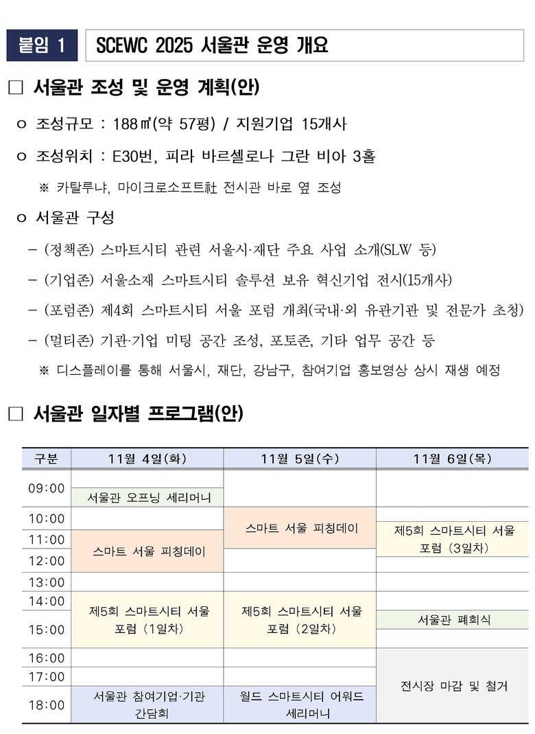 또한 서울관에서는 행사 전 기간 동안 서울의 스마트시티·AI 미래 비전을 제시하는 제5회 스마트시티 서울 포럼이 진행되며, 파리동부연합과의 업무협약 체결을 비롯해 MIT 센서블시티랩, 아람코, SCEWC 등 글로벌 AI‧스마트시티 연구기관 및 기업 관계자와의 협력 간담회가 이어질 예정이다.