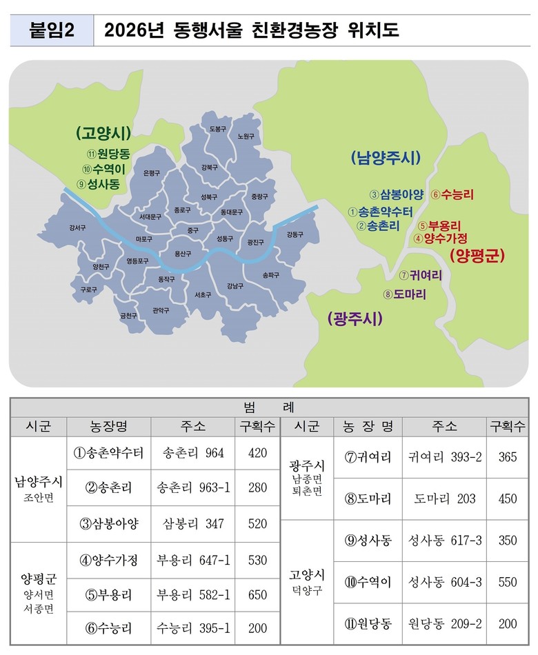 2026년 동행서울 친환경농장은 서울시 근교 11개소, 4,515구획으로 전년도 대비 100구획을 확대하여 분양한다.