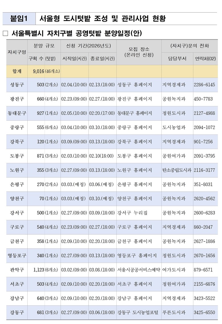 특히, 2월 3일(화) 도봉구 누리집을 통해 가장 먼저 분양을 시작하는 공영텃밭(자투리텃밭)은 도심 내 국·공유지와 개발제한구역 등 그간 방치돼 왔던 유휴 토지를 정비해 조성한 공간으로, ‘서울형 도시텃밭 조성 및 관리 사업’의 일환으로 추진된다.