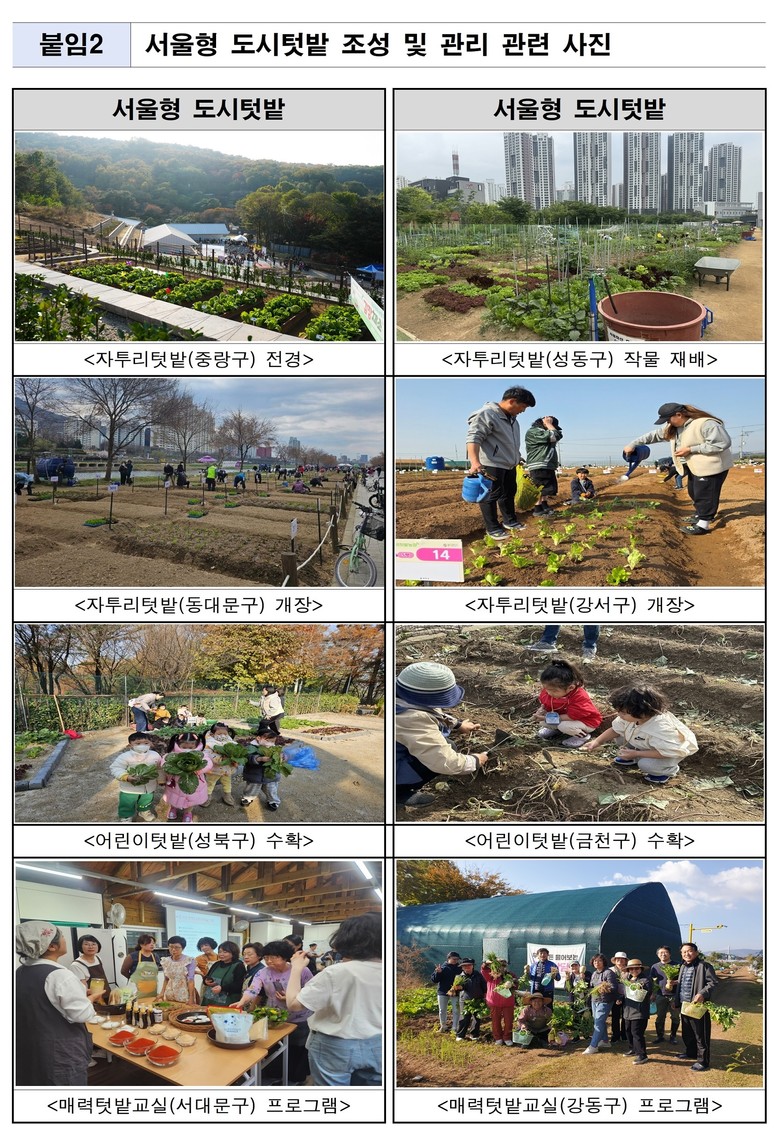 도시농업은 ▲먹거리 자급 ▲건강한 여가와 체험 ▲자녀 생태교육 ▲탄소중립 실천 등 다양한 사회적 효과를 지니며, 서울시는 이러한 가치를 확산하기 위해 공간 확충과 프로그램 운영을 지속적으로 병행하고 있다.