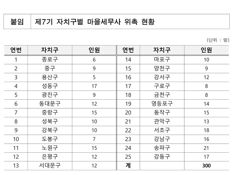 2015년 20개 자치구 143명으로 시작한 서울시 마을세무사는 지난해까지 25개 자치구 427개 동에서 296명이 활동해 왔다. 재능기부를 원하는 세무사가 신청하면 시가 동(洞) 단위로 연결해 주고, 한 번 위촉되면 2년간 활동하게 된다.