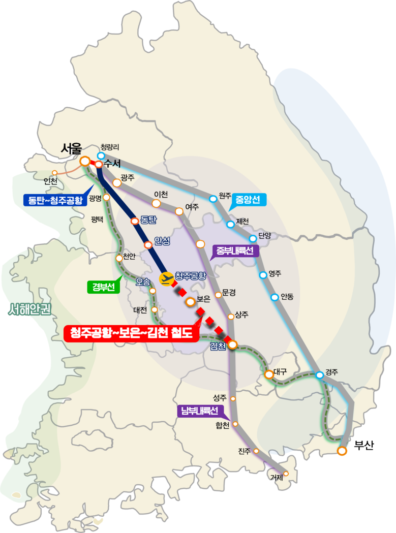 청주공항~보은~김천 철도 노선은 행정수도 관문이자 중부권 거점공항인 청주국제공항과 철도가 없는 보은군, 경상북도의 철도 요충지인 김천시를 연결하는 약 96km의 신설 철도사업으로, 이를 통해 중·남부 내륙지역에 최단 철도망이 형성된다.