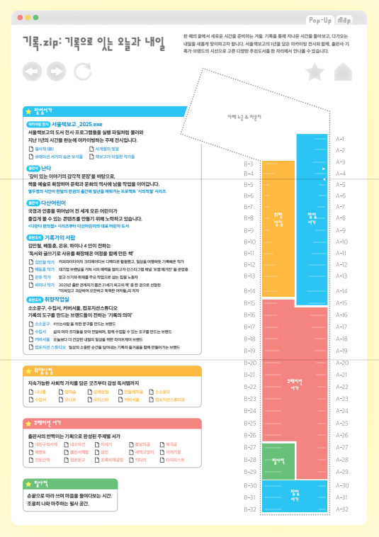 먼저 서울책보고는 12월 16일(화)부터 내년 2월 22일(일)까지 ‘형형색책(形形色册)’ 네 번째 시리즈 <기록.zip : 기록으로 잇는 오늘과 내일>을 개최한다. 이번 프로그램은 ‘기록’을 대주제로 삼아, 지나온 시간을 회고하고 다가올 내일을 준비하는 다양한 전시와 행사로 구성됐다.