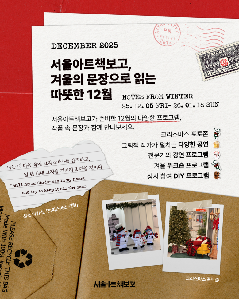 더불어 온 가족이 즐길 수 있는 프로그램도 풍성하다. ‘겨울 동화’를 테마로 한 포토존이 운영되며, 12월 한 달간 그림책 작가가 직접 선보이는 ‘인형극 공연’이 총 5회 진행된다. 이외에도 ‘크리스마스 리스 마크라메 만들기’, ‘크리스마스 북바인딩’ 등 겨울 감성을 담은 예술 워크숍이 상시 운영될 예정이다.