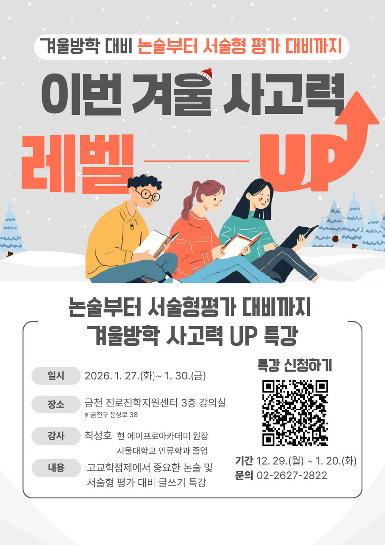 [금천구 세계타임즈=이장성 기자] 금천구(구청장 유성훈)는 겨울방학을 맞아 관내 중학생과 예비고등학교 1학년을 대상으로 논술·서술형 특강을 운영한다고 밝혔다.