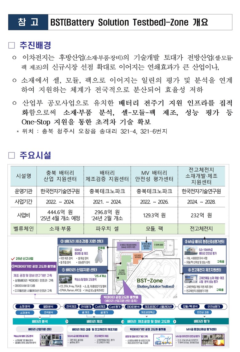 * BST(Battery Solution Testbed)-Zone : 배터리 전주기 지원 인프라(충북 배터리산업 지원센터 등 5개 센터)를 집적화