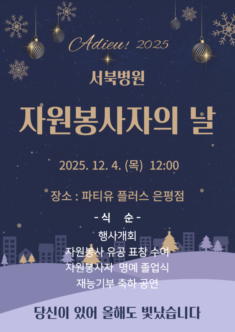 이번 행사는 ‘따뜻하고 아름다운 문화 확산’이라는 슬로건 아래 진행되며, 2025년 한 해 동안 서북병원 자원봉사활동처 소속 자원봉사자들의 이야기와 활동을 담은 오프닝 영상을 시작으로 자원봉사 유공자 표창 수여, 명예졸업자 감사패 수여, 나눔앙상블의 축하공연 등 다채로운 프로그램으로 이어진다.