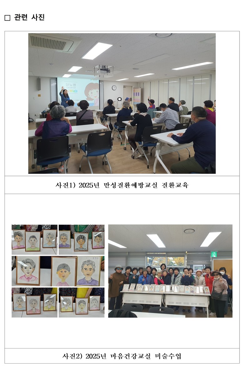 정서 건강을 위한 ‘마음건강 교실’은 3·4·6·7·9·11월, 매주 목요일 오후 2시 30분부터 3시 30분까지 운영된다. 미술치료, 노래교실, 건강댄스, 웃음치료 등 체험형 프로그램을 통해 우울감 완화와 정서 안정을 돕는 과정으로, 월별 4주 과정으로 진행된다.
