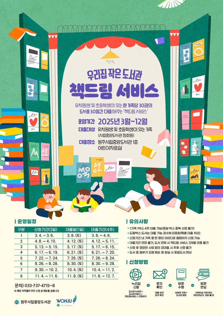 자세한 사항은 시립중앙도서관 누리집(lib.wonju.go.kr/ja)를 확인하거나 어린이자료실(☎033-737-4717)로 문의하면 된다.