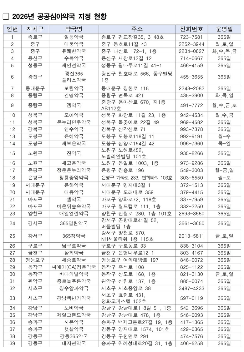서울시는 늦은 밤 갑작스러운 증상으로 어려움을 겪는 시민을 위해 밤 10시부터 다음 날 새벽 1시까지 운영하는 공공심야약국을 25개 자치구, 총 39개소를 운영하고 있다. 이 중 365일 운영되는 약국은 28곳, 요일별로 운영되는 약국은 11곳이다. 요일별 운영은 월‧수‧금 등 특정 요일을 지정해서 운영하는 방식이다.