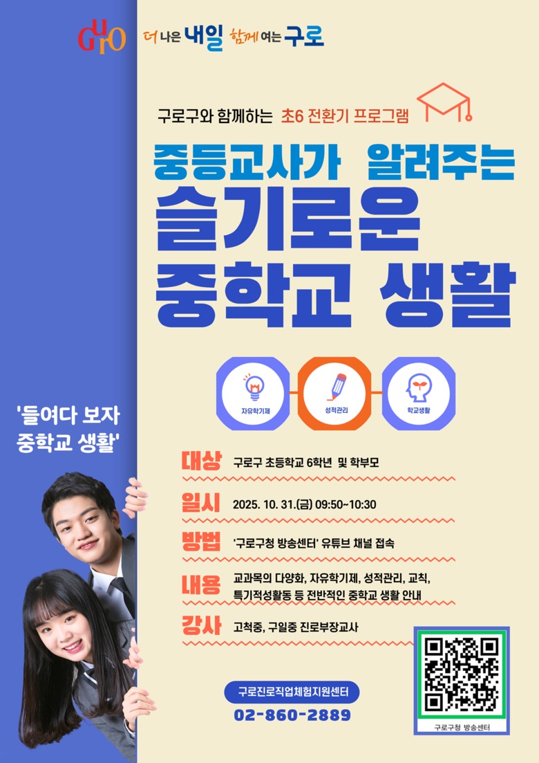 - 진로교사 참여, 생생한 현장 경험 전달·질의응답 진행 [구로구 세계타임즈=이장성 기자] 구로구(구청장 장인홍)가 10월 31일 초등학교 6학년 학생과 학부모를 대상으로 중학교 입학 전 알아야 할 주요 정보를 안내하는 ‘슬기로운 중학교 생활’ 프로그램을 유튜브 생방송으로 운영한다.