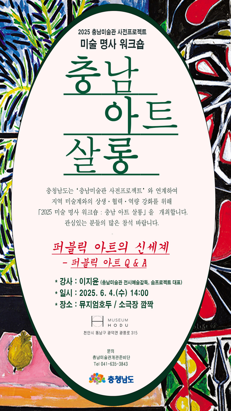 도 관계자는 “이번 워크숍은 지역 예술인과 도내 공·사립 미술관 관계자들이 현장 중심의 실질적인 통찰력을 갖출 수 있는 계기로 마련했다”라며 “앞으로도 지속 가능한 예술 생태계 조성과 충남미술관의 성공적인 개관을 위해 다양한 교육·소통 프로그램을 발굴·운영할 것”이라고 말했다.