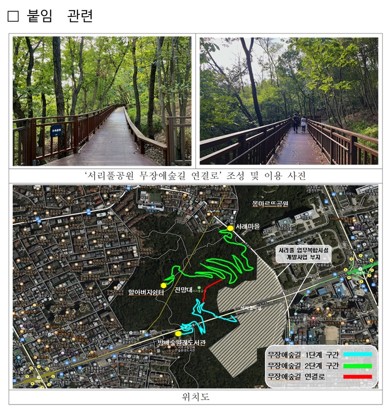 그동안 서리풀공원에는 무장애숲길 1단계 구간(방배숲도서관)과 2단계 구간(할아버지쉼터~서래마을)이 각각 조성돼 있었으나, 두 구간 사이가 단절되어 경사가 급한 일반 산책로를 거쳐야만 이동할 수 있는 불편이 있었다.