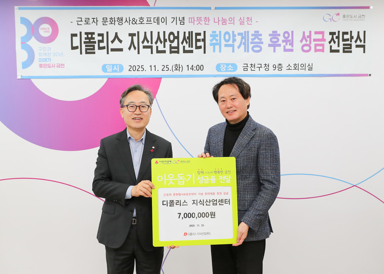 한편, 디폴리스 지식산업센터는 매년 호프데이 행사 후 성금을 기탁해오고 있으며, 이번 성금은 금천구 취약계층을 위한 겨울철 김장 나눔 후원금으로 사용될 예정이다.