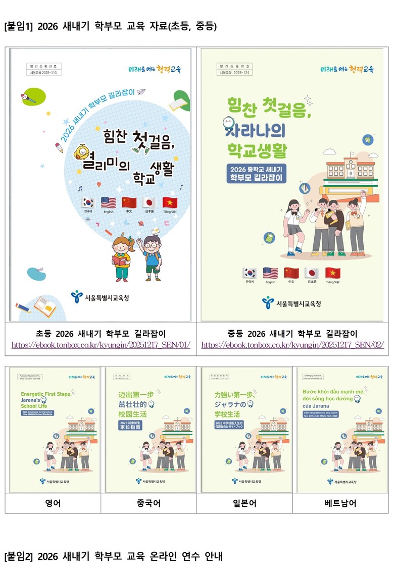 이와 함께 서울시교육청은 학부모가 원하는 시간과 장소에서 참여할 수 있도록 「2026 초·중 새내기 학부모 교육」을 온라인으로 운영한다. 이번 교육은 초등학교 및 중학교 1학년 입학 예정 자녀의 학교 적응을 돕고, 학부모의 자녀 양육 역량을 높이기 위해 마련됐으며, 현직 초·중등 교사가 학교 현장의 경험을 바탕으로 실질적인 내용을 중심으로 강의를 진행할 예정이다.