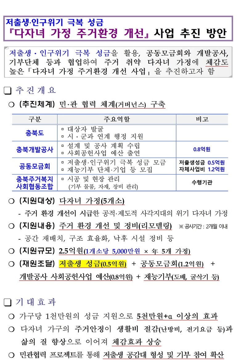 ‘다자녀 가정 주거환경 개선 사업’은 저출생·인구위기 극복 성금과 공동모금회, 개발공사의 사회공헌활동 예산 등 총 2억 5천만 원에 민간의 재능기부를 더해 주거환경이 열악한 다자녀 가구의 주택 리모델링을 지원하는 프로젝트이다.