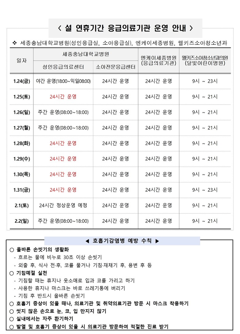 세종충남대학교병원 소아전문응급의료센터와 엔케이세종병원 응급실은 설 연휴 기간에도 24시간 정상 운영한다.