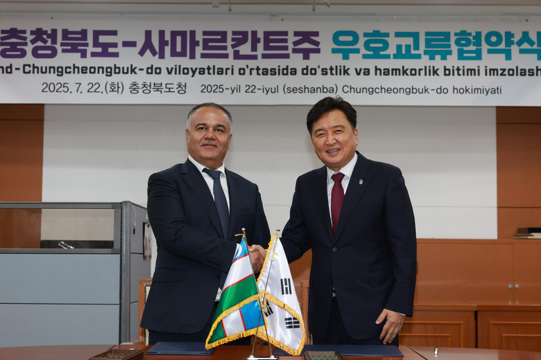충북도는 22일(화) 도청 소회의실에서 김영환 충북도지사와 보보예프 아디즈(Boboev Adiz) 사마르칸트 주지사가 참석한 가운데 우호교류협약을 체결했다고 밝혔다.