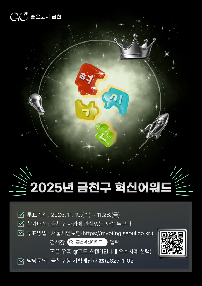 - AI, 안전, 복지 등 행정혁신 사례 10건 중 선택 [금천구 세계타임즈=이장성 기자] 금천구(구청장 유성훈)는 11월 19일(수)부터 11월 28일(금)까지 10일간 ‘2025년 금천혁신어워드’ 온라인 투표를 진행한다고 밝혔다.