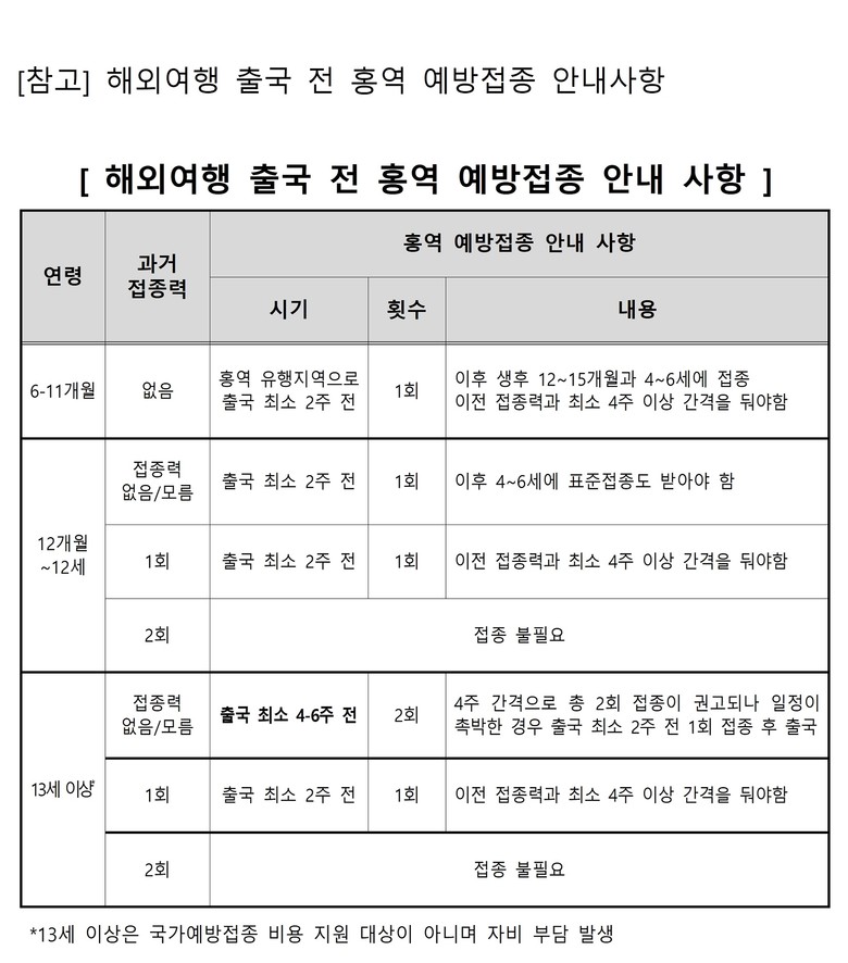 1세 미만 영유아는 홍역 유행 국가 방문을 자제하되 방문이 불가피하다면 생후 6∼11개월은 출국 2주전까지 1회 접종이 필요하다.