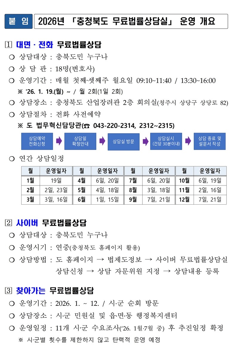 [충북 세계타임즈=이현진 기자] 충북도는 19일, 2026년 첫 대면·전화 무료법률상담 일정을 시작으로 「2026년 충청북도 무료법률상담실」 운영을 본격적으로 시작할 계획이라고 밝혔다.