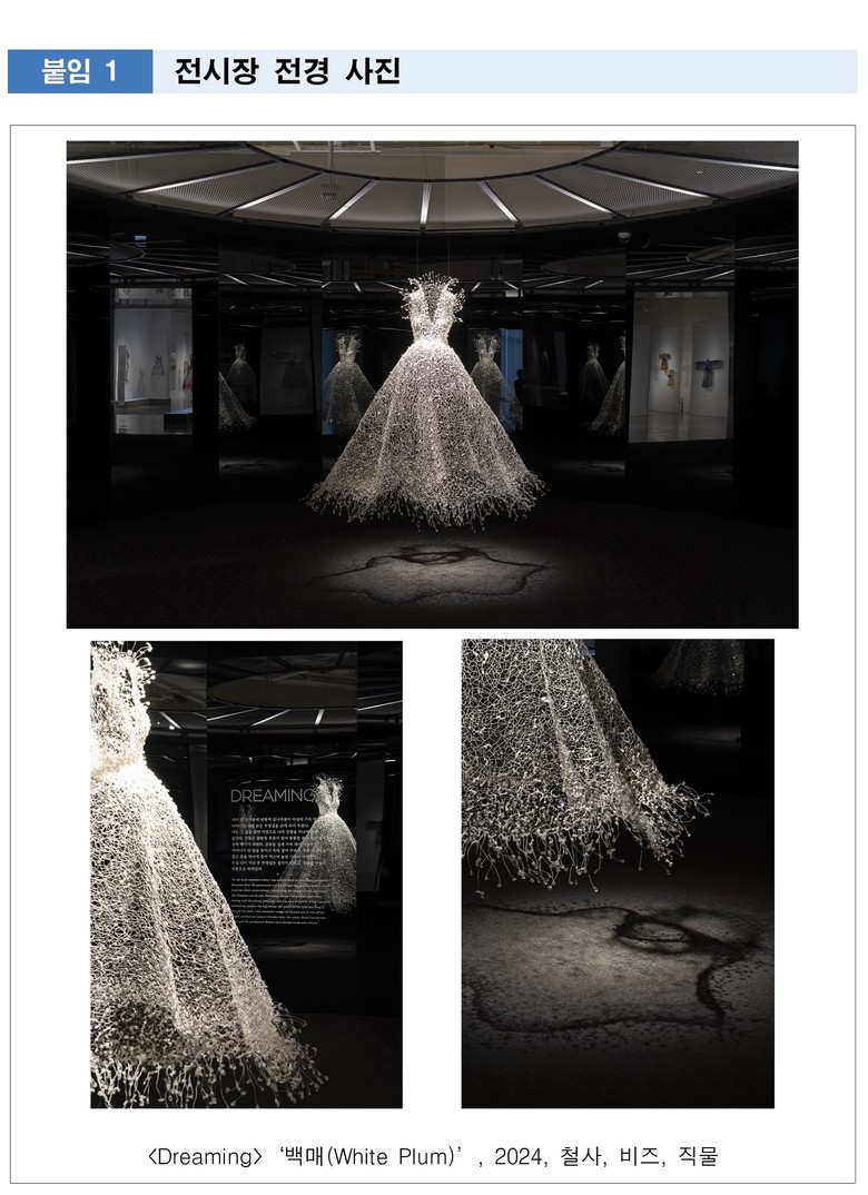 특히 3층 전시장 도입부< Dreaming> 공간이 이번 전시를 대표하는 화제의 공간이자 주요 포토스폿으로 큰 인기를 끌고 있다. 어둠 속 중심에 전시된 ‘백매(白梅)’ 드레스는 검은 거울과 조명 연출을 통해 몽환적인 장관을 만들어내며 관람객의 발길을 붙잡고 탄성을 자아낸다.