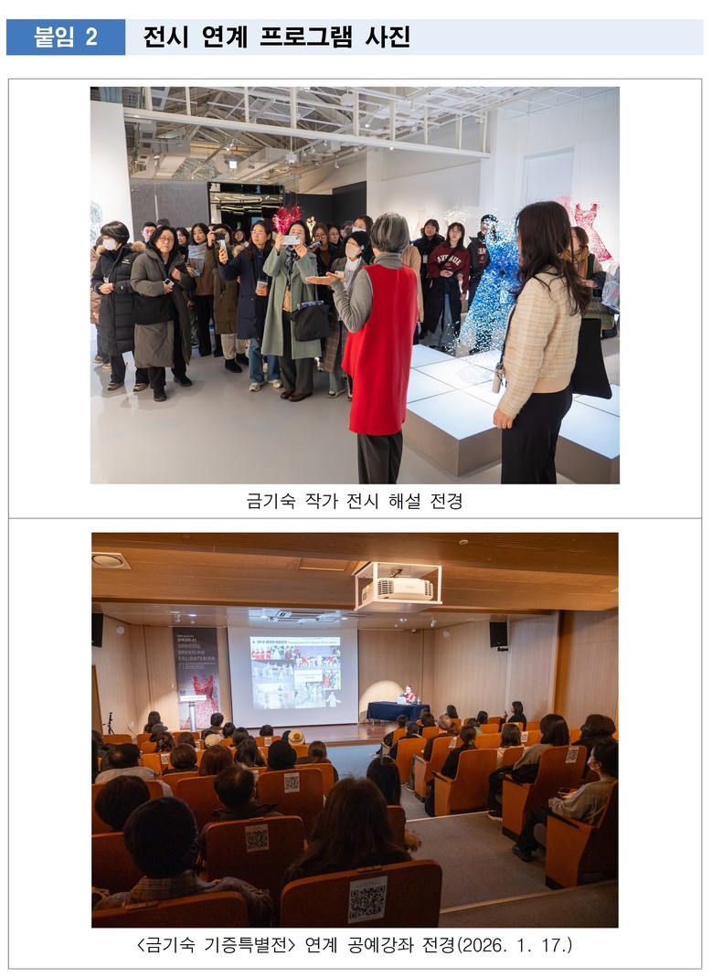 이번 전시는 금기숙 작가와 함께하는 워크숍 프로그램을 통해 관람객이 작가와 직접 소통할 수 있는 특별한 경험을 제공한다.