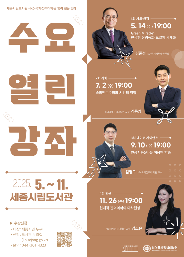 수요열린강좌에는 세종시민 누구나 참여할 수 있으며, 수강신청은 시립도서관 누리집(lib.sejong.go.kr)에서 선착순으로 접수한다.