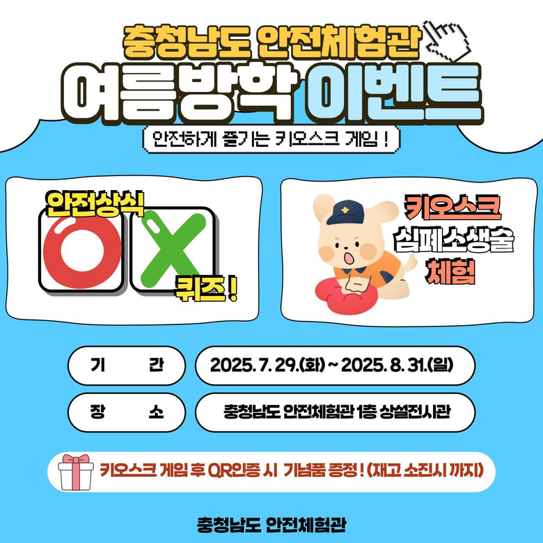 이번 이벤트는 충남안전체험관 1층 상설전시관에서 진행하며, 참가 신청 및 자세한 사항은 충남안전체험관 누리집(https://safe.cn119.go.kr)과 대표전화(☎ 041-590-6300)를 통해 확인할 수 있다.